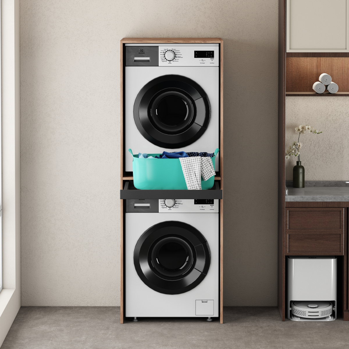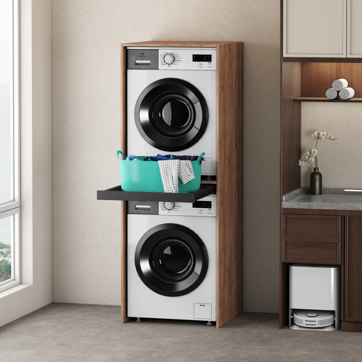 Nowoczesna, prosta, minimalistyczna szafka typu tower na pralki i suszarki, ustawiane jedna na drugiej.