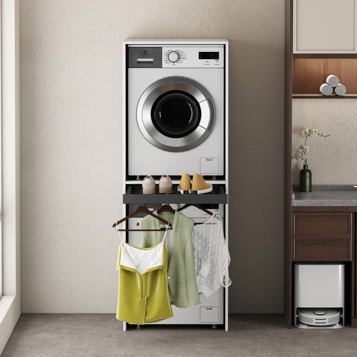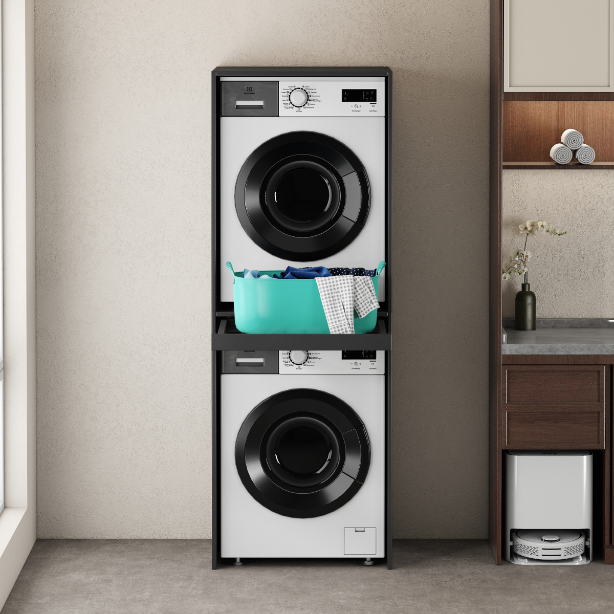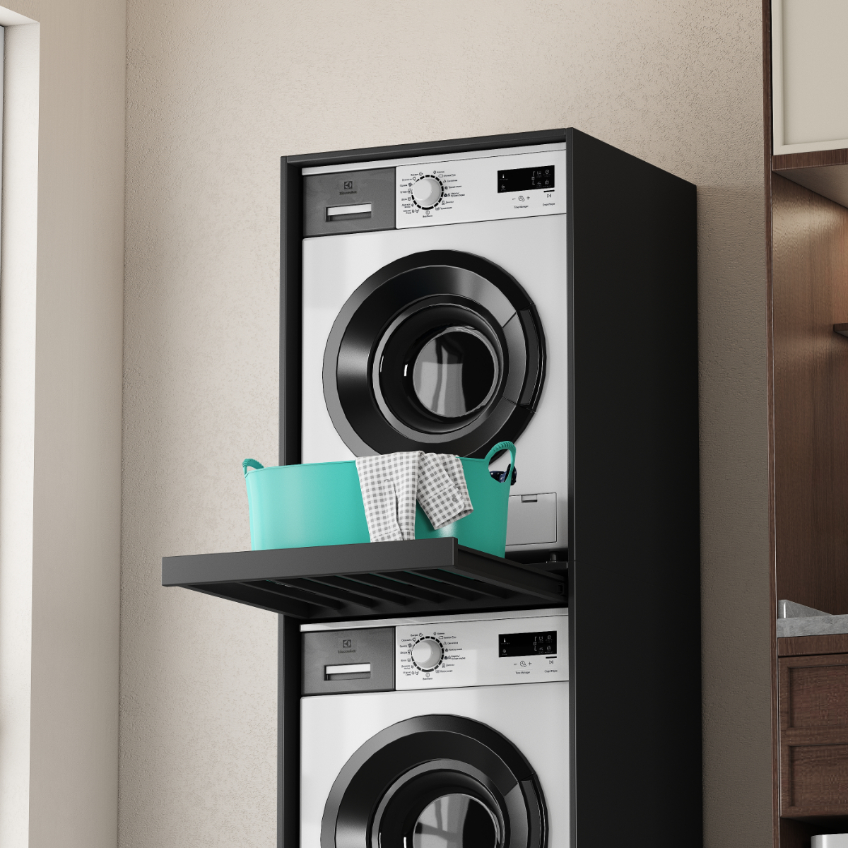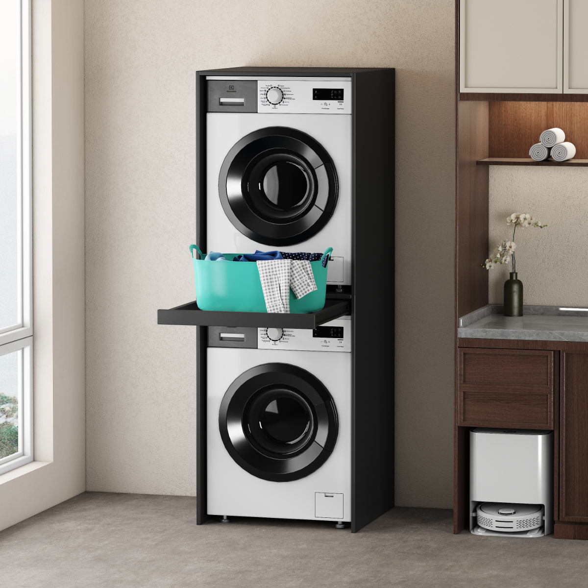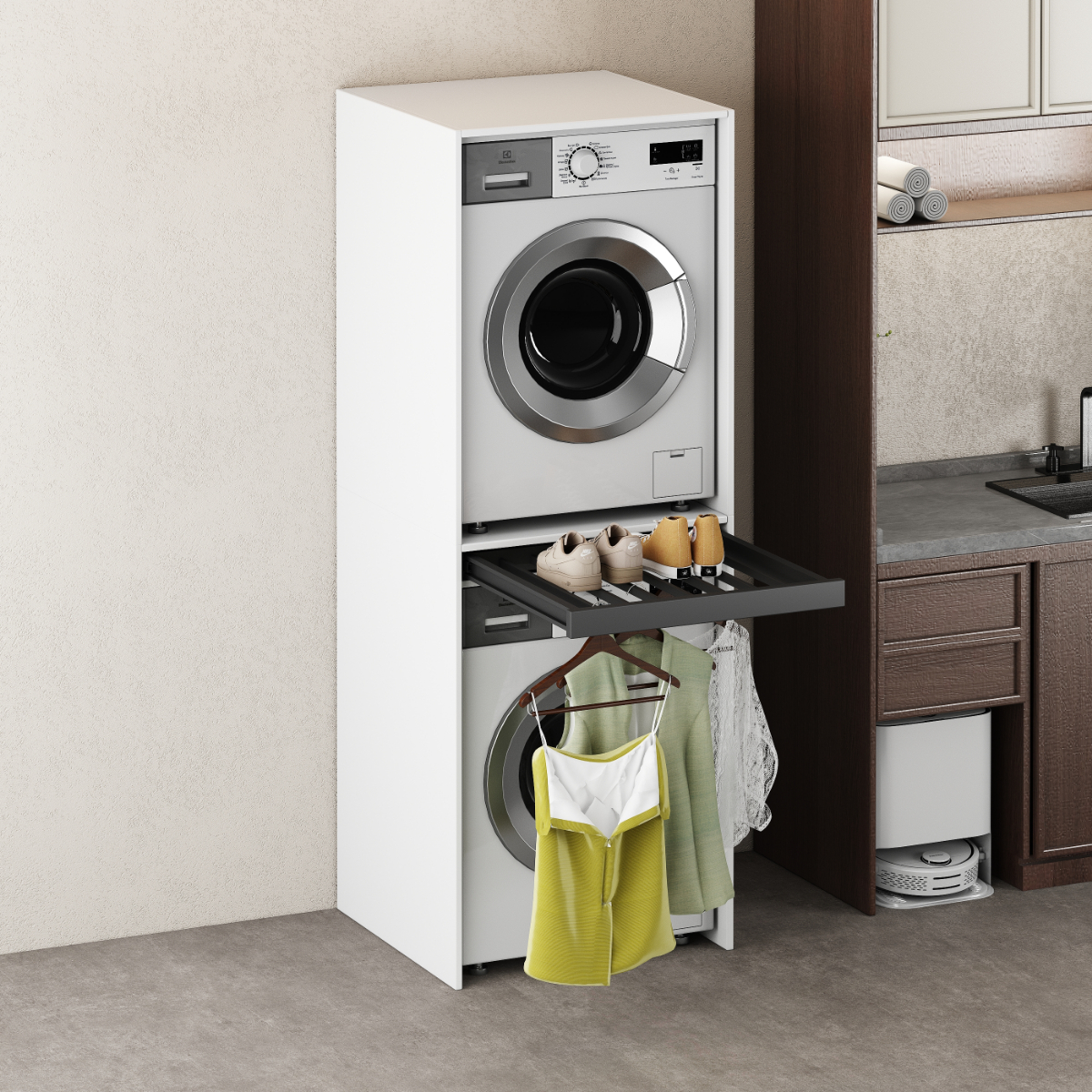 Nowoczesna, prosta, minimalistyczna szafka typu tower na pralki i suszarki, ustawiane jedna na drugiej.