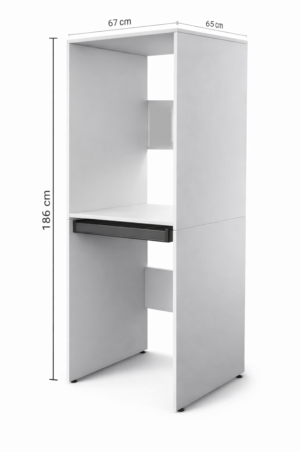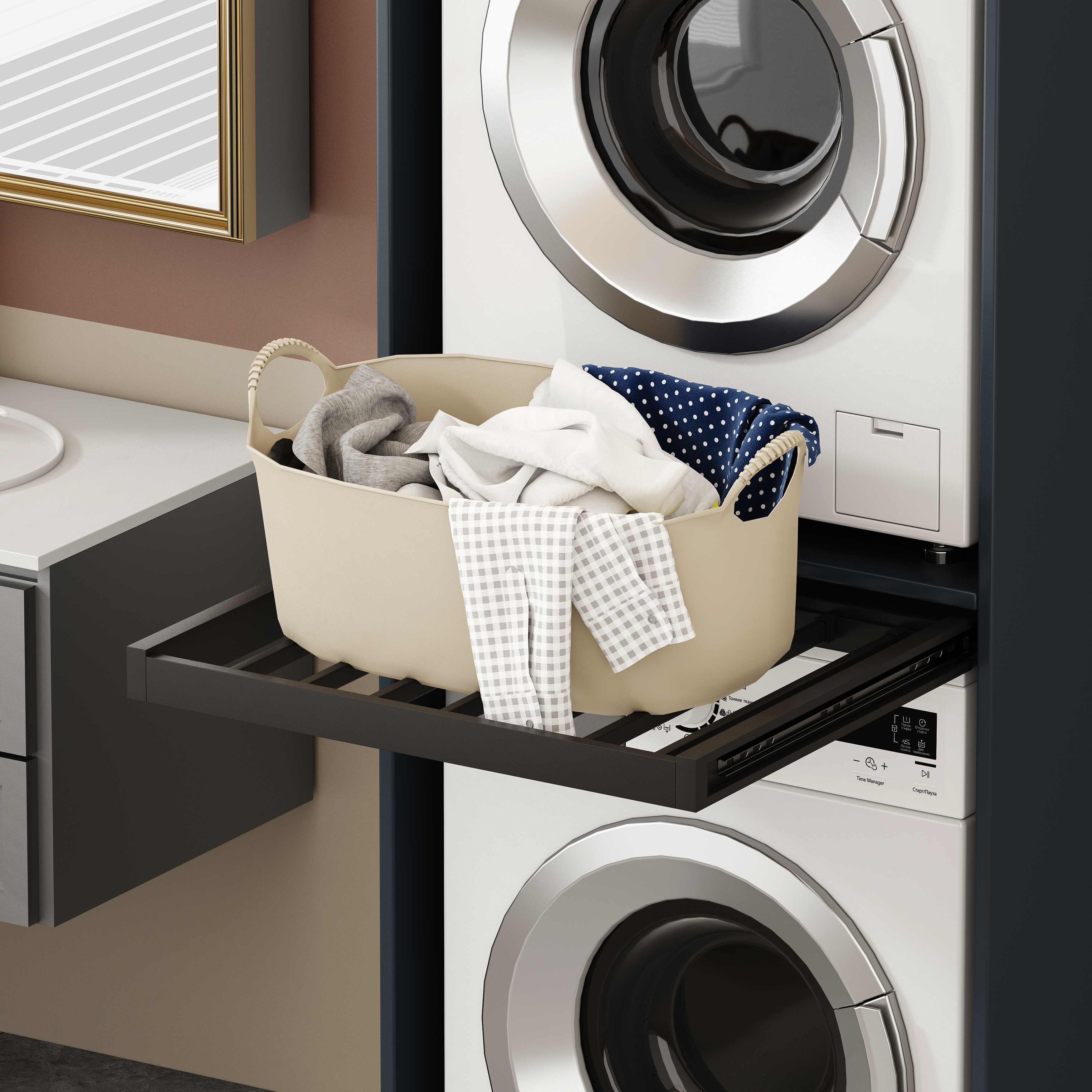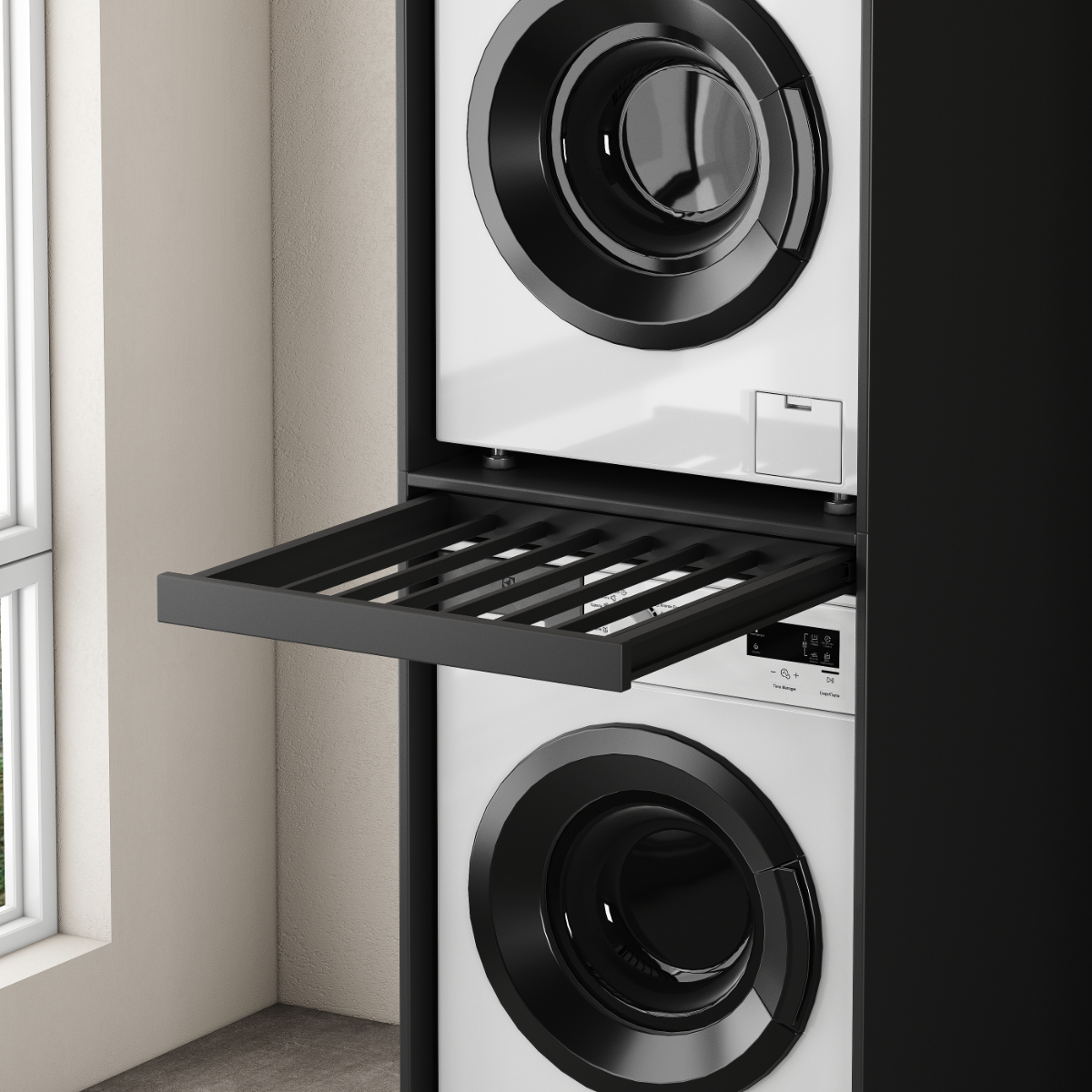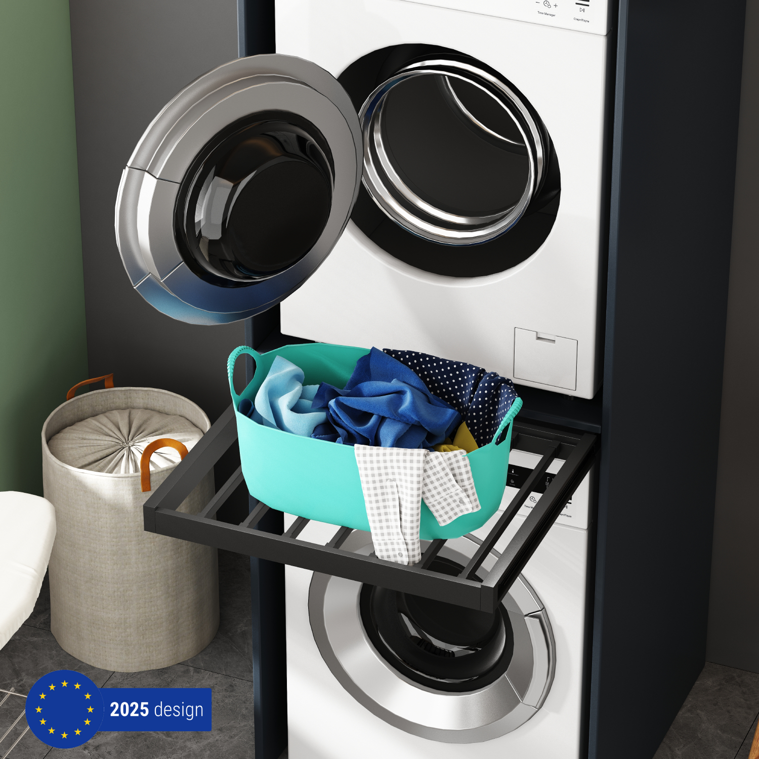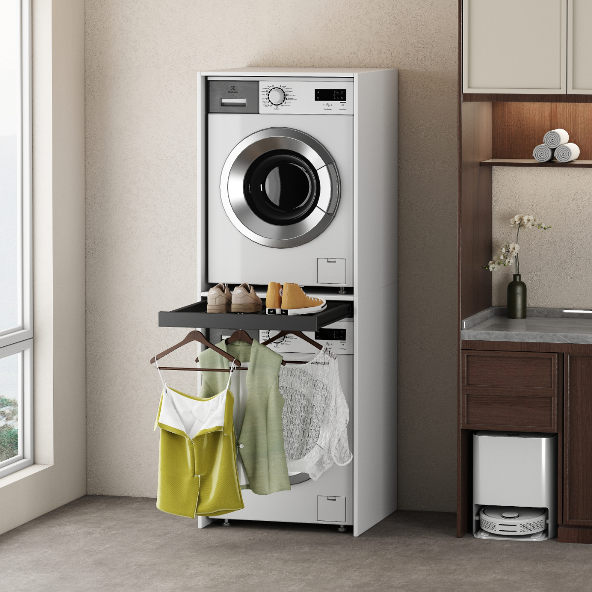 Nowoczesna, prosta, minimalistyczna szafka typu tower na pralki i suszarki, ustawiane jedna na drugiej.